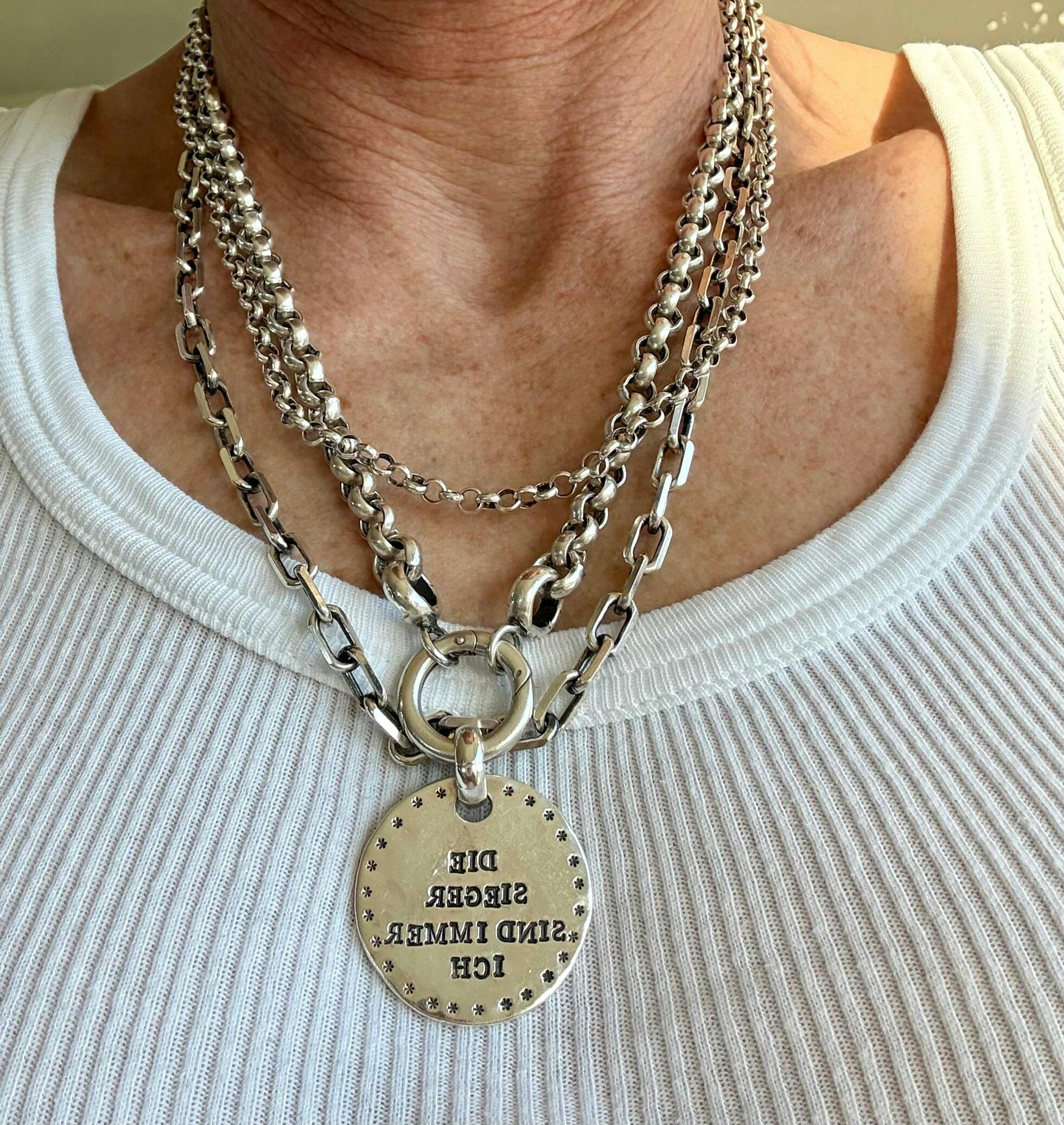 Jede Halskette trägt am Karabiner ein kleines rundes Logo-Amulett. Auf Wunsch kann der 0,5cm grosse Anhänger auf der Rückseite mit einer eigenen Gravur von EINEM Buchstaben oder EINER Zahl kostenfrei personalisiert werden. Nach der Bestellung einfach eine Mail an uns.