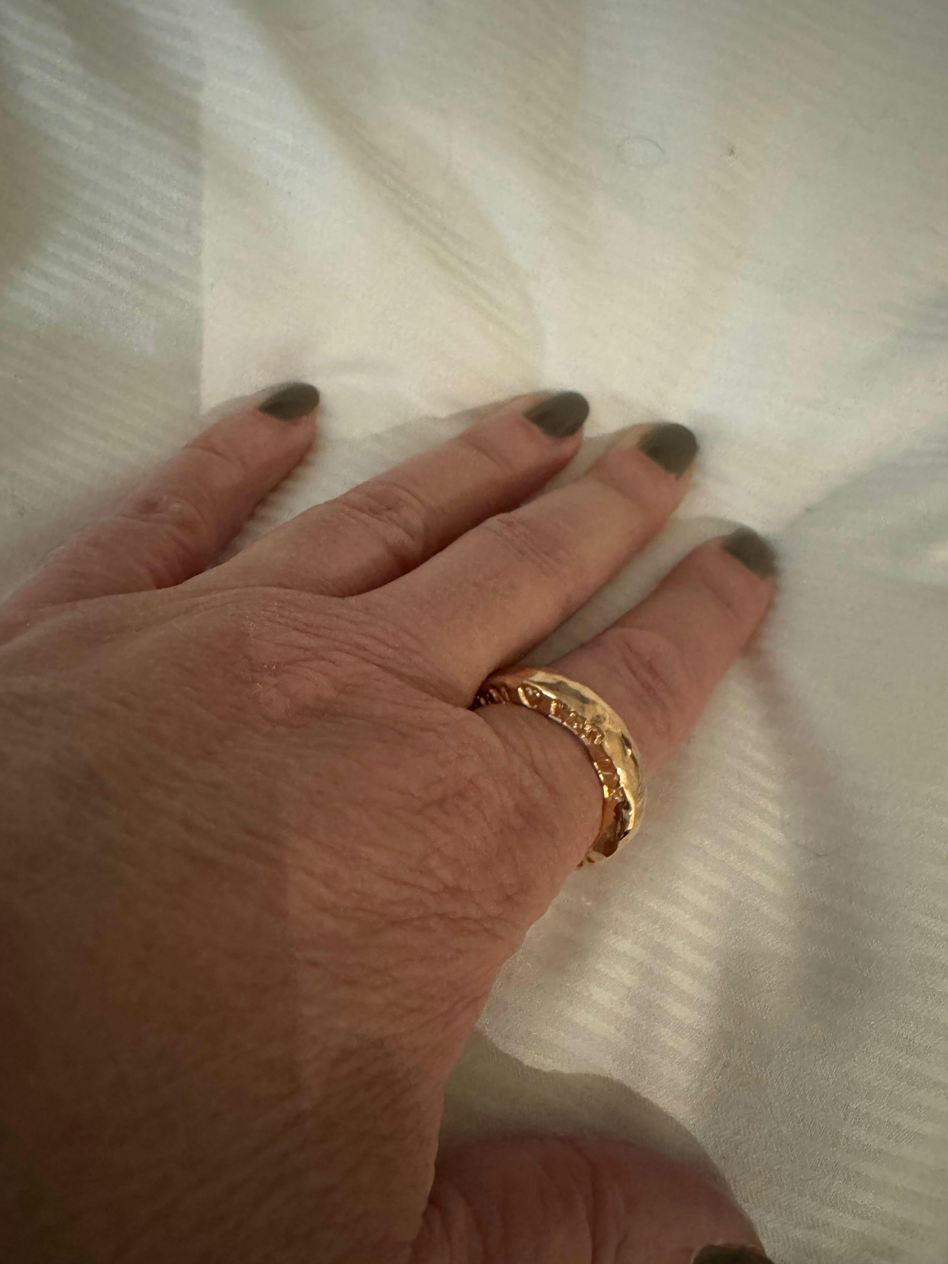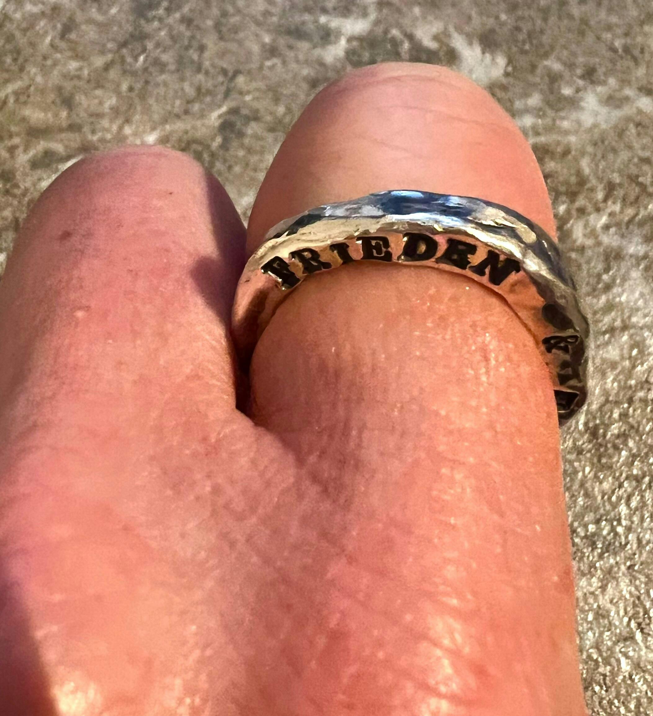 Massiver Ring mit Gravur aus reinem 925 Sterling Silber. Jeder gehämmerte Ring aus Silber und Gold wird in der Capulet Schmuck Werkstatt München von Hand geschmiedet. Der individuelle Ring ist mit eigener Wunschgravur perfekt als cooler Trauring, individueller Verlobungsring oder Partnerring und Glücksbringer.