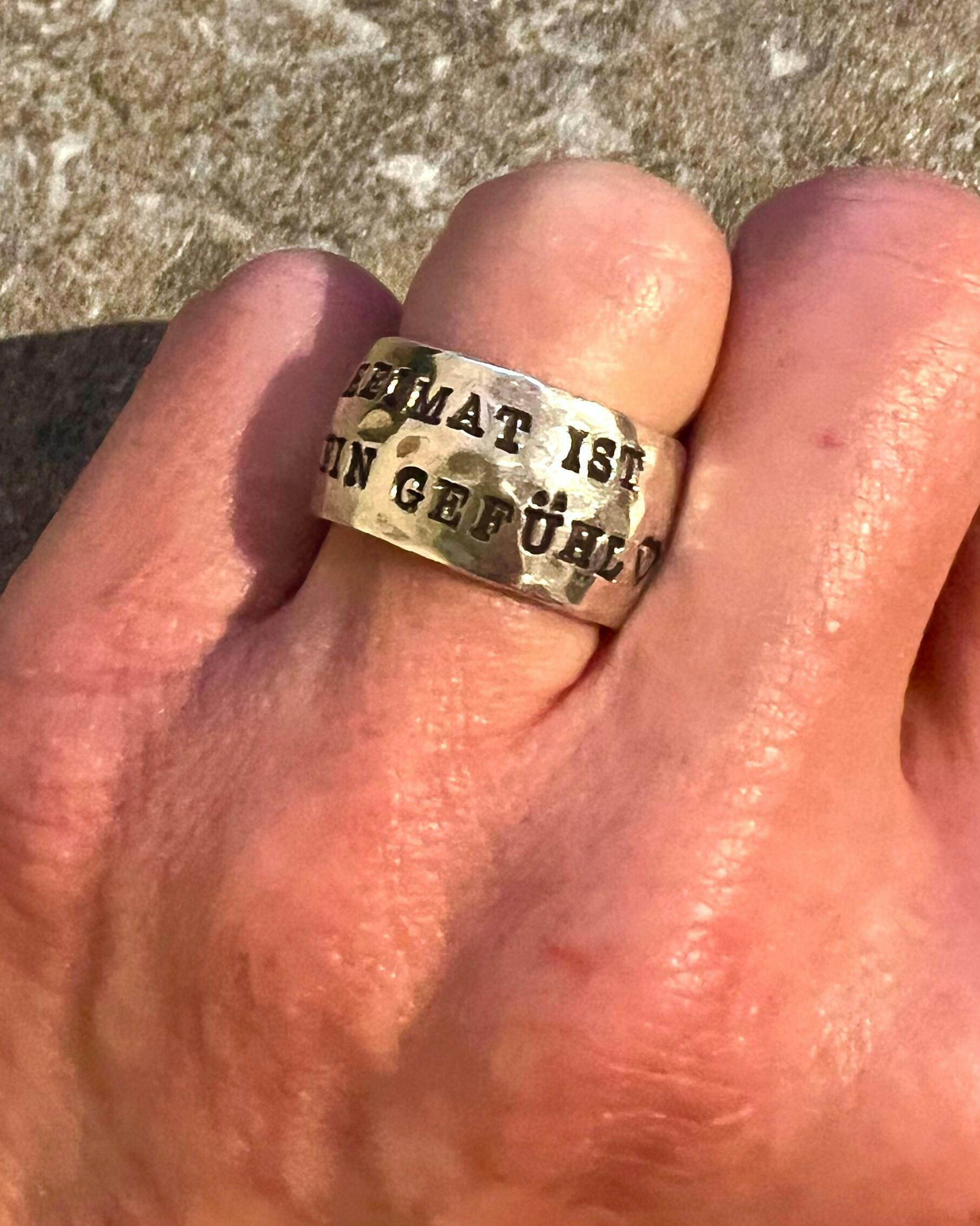 Breiter & massiver Ring mit Gravur aus reinem 925 Sterling Silber. Jeder gehämmerte Ring aus Silber und Gold wird in der Capulet Schmuck Werkstatt München von Hand geschmiedet. Der individuelle Ring ist mit eigener Wunschgravur perfekt als cooler Trauring, individueller Verlobungsring oder Partnerring und Glücksbringer.